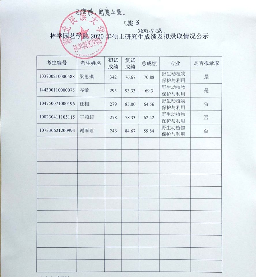林学园艺学院2020年硕士研究生成绩及拟录取情况公示