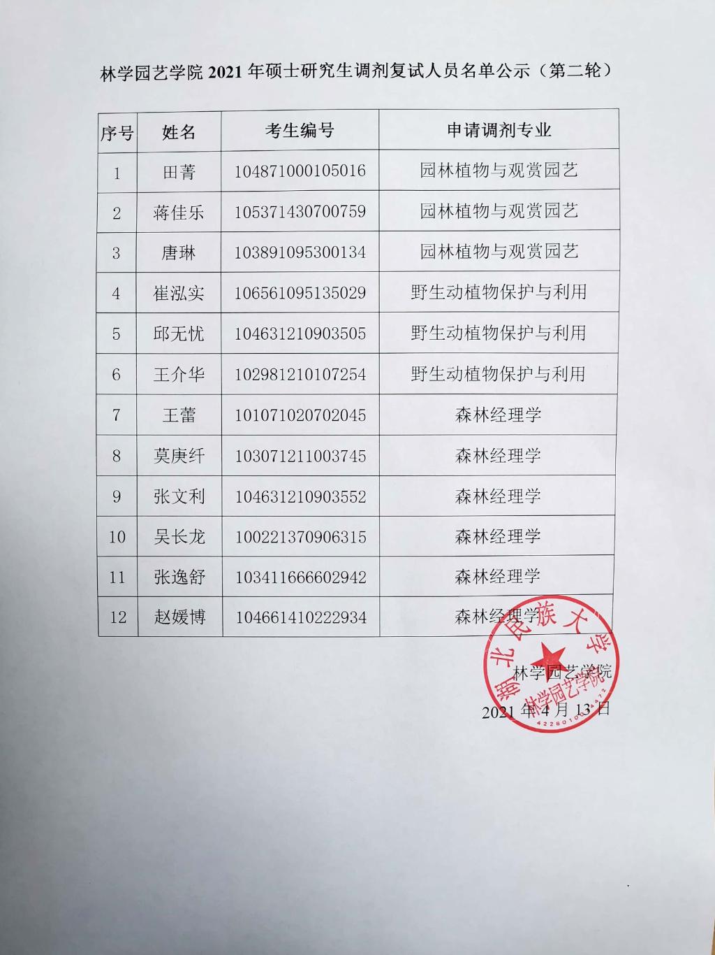 林学园艺学院2021年硕士研究生调剂复试人员名单公示(第二轮)