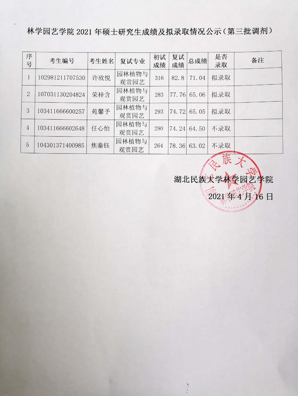 林学园艺学院2021年硕士研究生成绩及拟录取情况公示(第三批调剂)