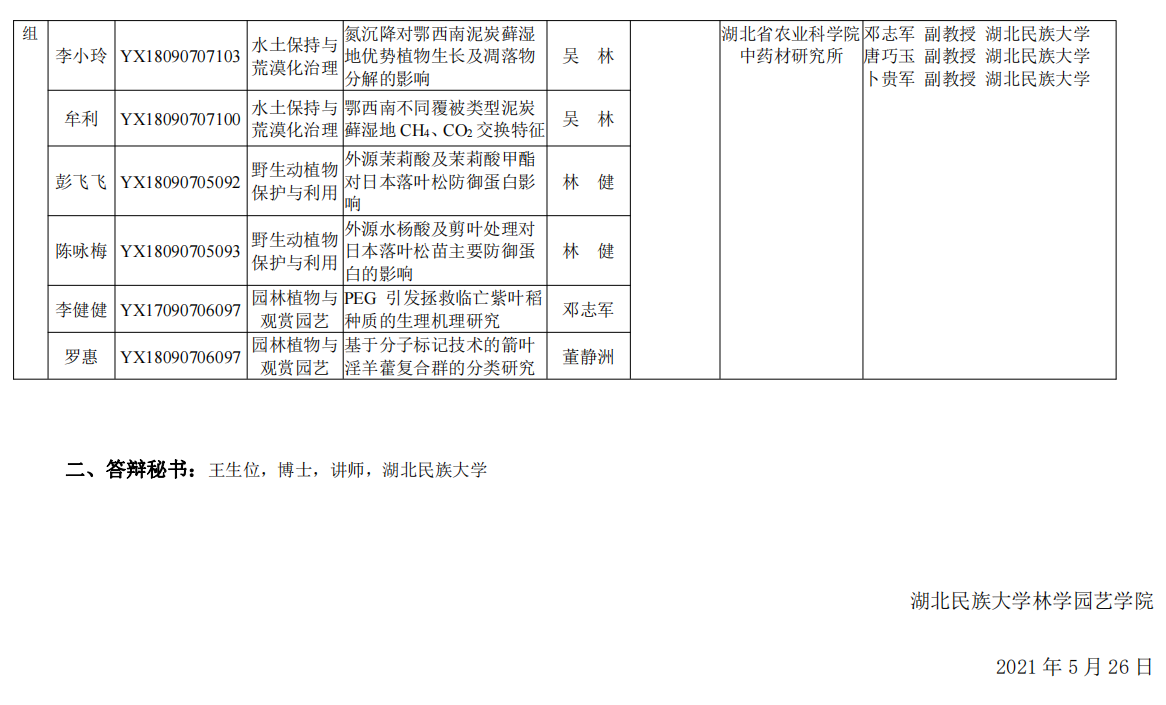 林学园艺学院2021年春季研究生毕业答辩公告