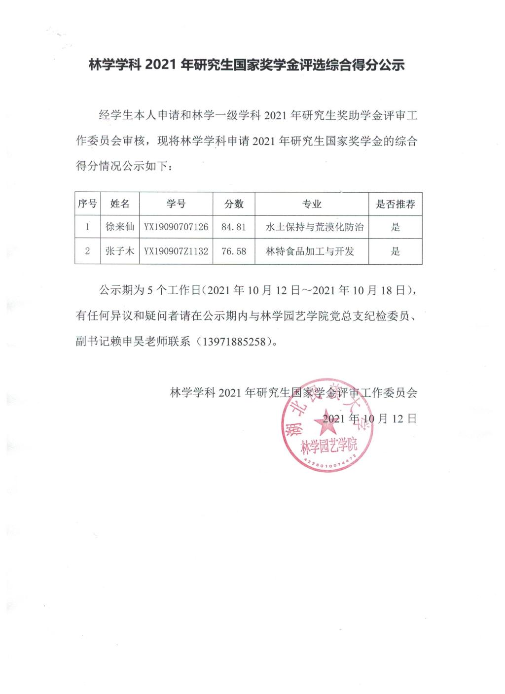 林学学科2021年研究生国家奖学金评选综合得分公示