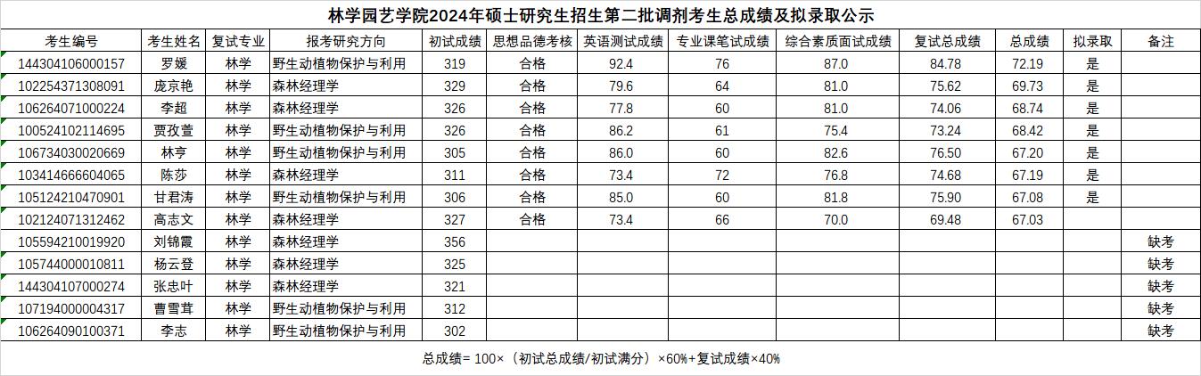 林学园艺学院2024年硕士研究生招生第二批调剂考生总成绩及拟录取公示