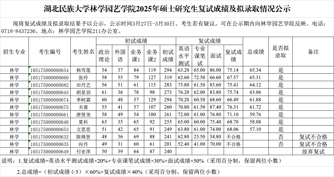 林学园艺学院2025年硕士研究生招生复试成绩与拟录取名单公示(第一志愿)