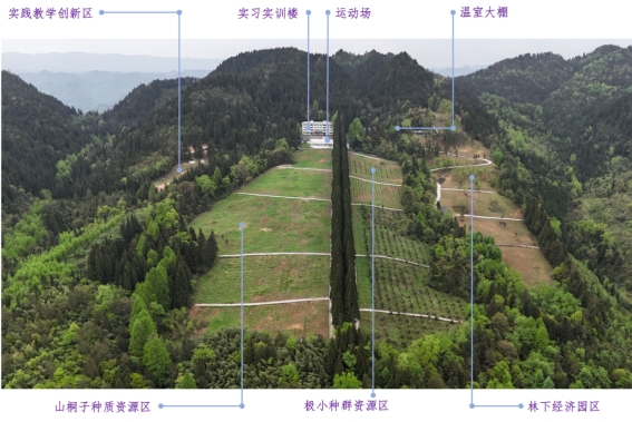 目前,已建成实习实训楼1栋(1840 平方米,可同时容纳学生80 人、指导教师15人开展实习实训)、办公楼1栋(包含教室、实验室、会议室以及学生食堂)、人工林监测样地52个(杉木、柳杉、毛竹等)、常绿落叶阔叶混交林大样地 1 块(1 公顷)及150亩教学科研园地(由山桐子种质资源区、极小种群资源区、林下经济园区和实践教学创新区四个区块构成)。