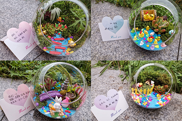 比赛现场,参赛组选手相互配合协作,根据举办方提供的生态瓶、苔藓、多肉植物等相关比赛用品制作自己的微景观生态瓶。各参赛组选手经过不断尝试创新,进行不同的搭配组合,创作出各具特色的生态瓶。其中,二十四号参赛小组选手将粉色、蓝色彩砂与各类小植物相结合,塑造出一个落英缤纷,潺潺流水的“桃花源”微景观生态瓶。比赛结束,由专业教师对参赛组作品进行打分,并在网上进行投票竞选。