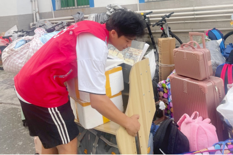 运货车到达后,志愿者分两批,一批在博爱9栋将行李搬上车,另一批到立人7栋、达人7栋、达人6栋,将车上的行李搬到即将入住的寝室。同时,志愿者的行为感动周围热心人士,他们身穿各式各样的衣服一同投入到志愿活动当中来。