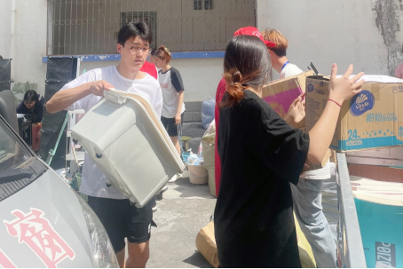 集合完毕后,老师与同学们开始投入到忙碌的搬运工作,搬运的同时维持现场秩序。志愿者头戴小红帽,身着红色志愿者马甲,迅速到达相应楼层,把打包好的包裹,搬至楼下装车。