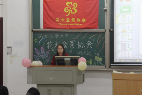 花木盆景协会第十六届会长曾宵通过播放花协招新视频介绍花协的整体情况。花协成员张雨欣从基本情况、工作方向、社团宗旨、分设部门、社团荣誉方面对花协进行简要讲解,向学生展示插花课、水晶滴管等特色活动。
