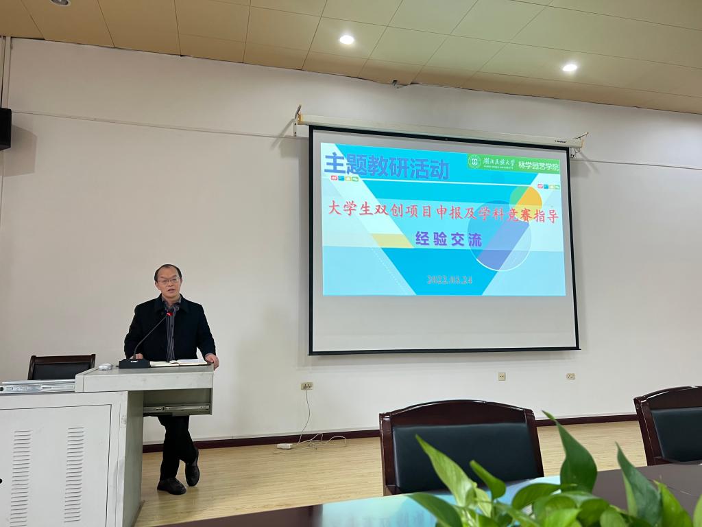 2022年3月24日下午,我院在重点实验室二楼会议室开展了“大学生双创项目申报及学科竞赛指导”主题教研活动,学院领导及全体教师参加了此次活动。活动中,林学系主任肖强教授、园艺专业教师石开明副教授分别分享了他们在大学生双创项目申报、大学生学科竞赛指导中的成功经验。