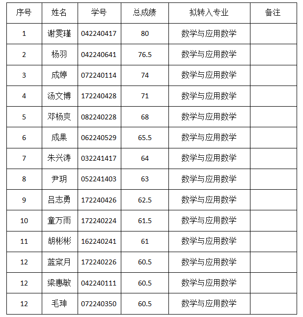 根据《3044am永利集团3044noc2022级普通本科学生转专业工作方案》、《数学与统计学院2022级学生转专业工作实施细则》,数学与统计学院2022级普通本科学生转专业工作考试环节已完成。现对申请转入数学与统计学院的2022级学生成绩进行公示,公示时间:2023年2月17日—2023年2月20日。请全体师生对公示名单进行监督,如有异议,请在公示期内向数学与统计学院学生科反映。