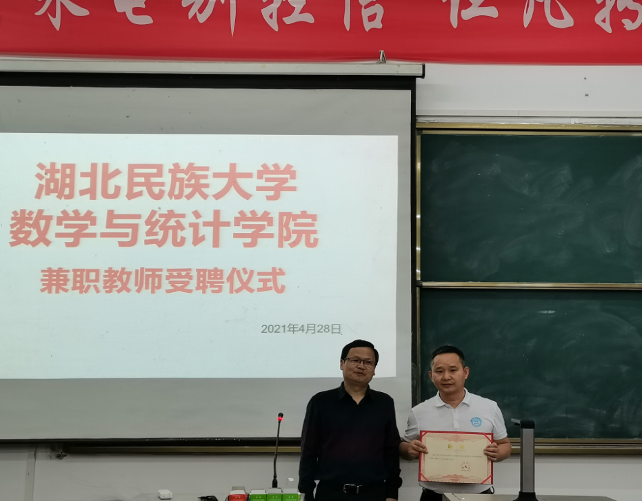 本网讯(见习记者 孙思 田宇/文 孙思 张粤/摄)4月28日晚,我院在3307教室举办屈韬兼职教师受聘仪式暨专题讲座。我院党总支书记赵魁轩,专业认证办公室主任及数学系主任向中义教授,副主任谢君辉副教授,宋昆仑老师出席本次讲座仪式。数学与应用数学专业全体在校学生参加了本次讲座仪式,我院副院长魏代俊教授主持本次讲座仪式。