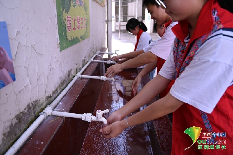 图为团队成员带领学生们餐后洗手。中国青年网通讯员 赵运 供图