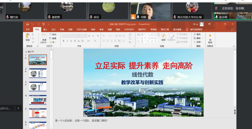 张志刚教授从多年参与教师教学创新大赛经验出发,就创新报告撰写、课堂实录视频制作、材料准备过程等多方面进行了详细指导。同时张志刚教授把曾经在课堂教学中遇到的问题,与参会老师进行了交流谈论。
