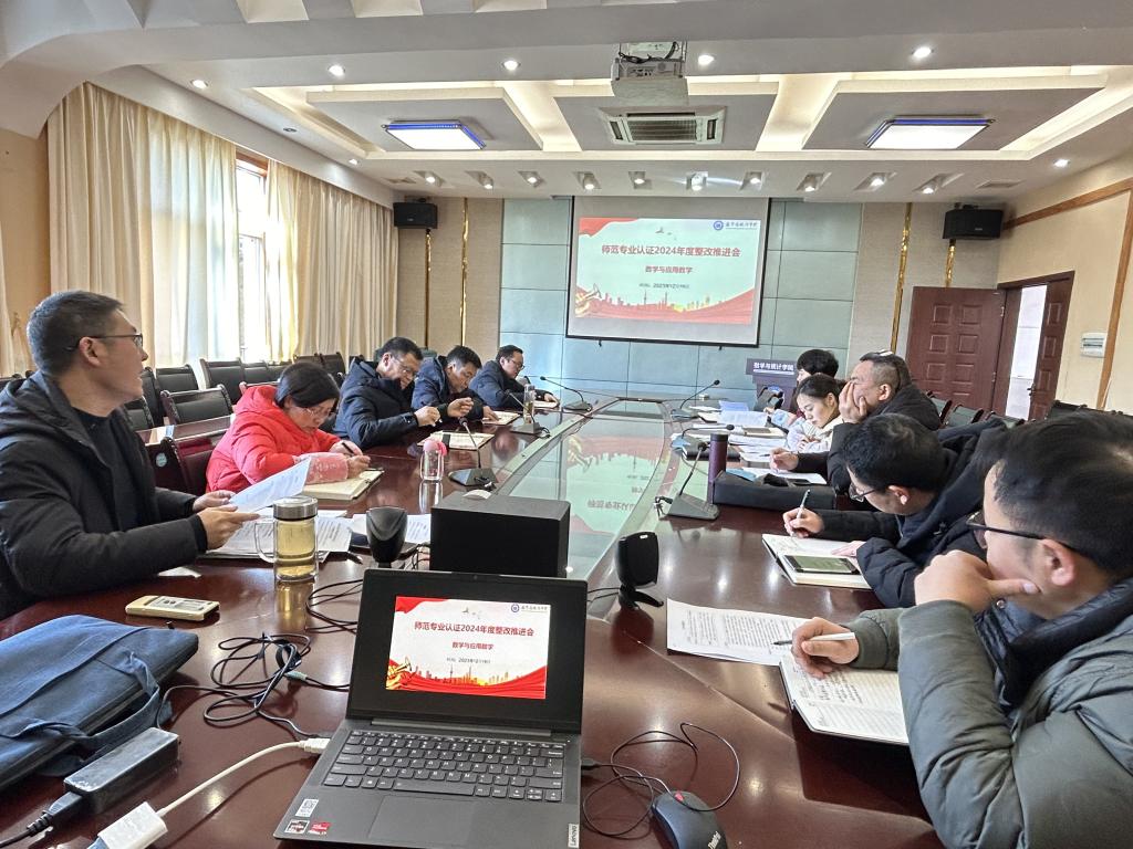12月19日下午,学院在四楼会议室召开师范专业认证整改工作推进会,会议由副院长唐利明主持,学院党总支书记赵魁轩、院长魏代俊、副书记郑敏、副院长向会立、数学系主任向中义、副主任赵远安、部分数学系老师以及各科室负责人出席会议。