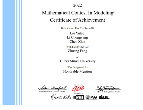 我院一共有21名学生组队参加本次比赛。由我院周敏老师指导的张成洋、孙思扬、余文杰一组同学荣获Meritorious Winner奖1项,由我院方壮老师指导的刘玉涛、李崇阳、陈骁一组同学荣获Honorable Mention奖1项,另有4个组获Successful Participant奖。