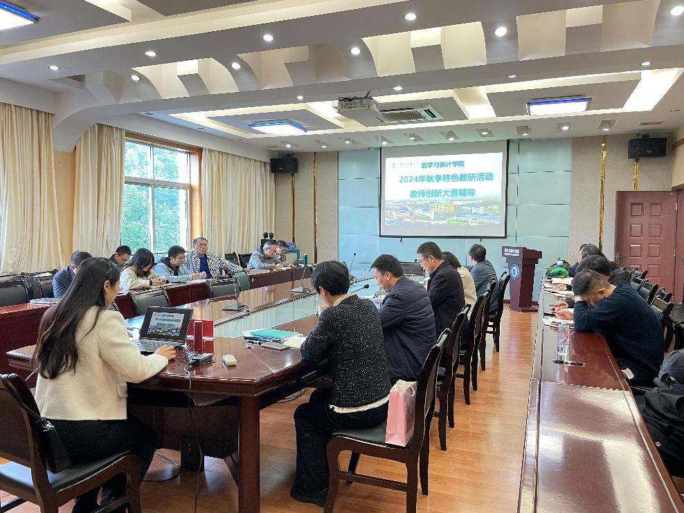 为了进一步推进我院2024年教师教学创新大赛的备赛工作,同时为了激发教师教学创新,探讨育人新途径,满足各专业发展和教师个人成长的需求,11月14日下午,我院在四楼会议室举办了以教师教学创新大赛为主题的特色教研活动,此次活动特邀永利官网外国语学院洪佳丽老师作经验分享,洪佳丽老师此前在第四届湖北省高校教师教学创新大赛中荣获一等奖,数学与统计学院全体教师共同参与了该项活动。