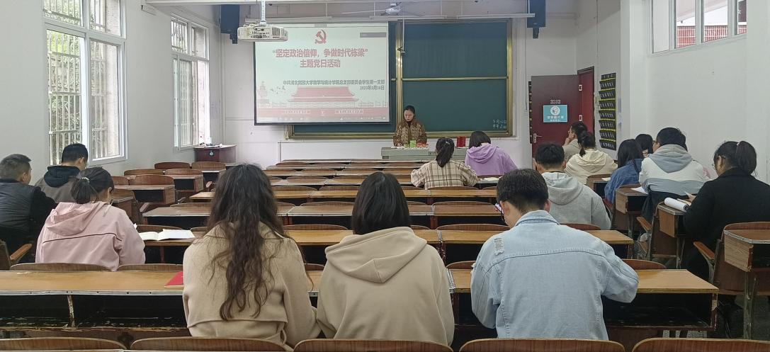 本网讯(记者 张粤/文 张粤/摄)2023年3月16日,我院学生第一支部在数学与统计学院3203教室开展以“坚定政治信仰,争做时代栋梁”为主题的3月支部主题党日活动,会议由支部书记黄丽娜同志主持。
