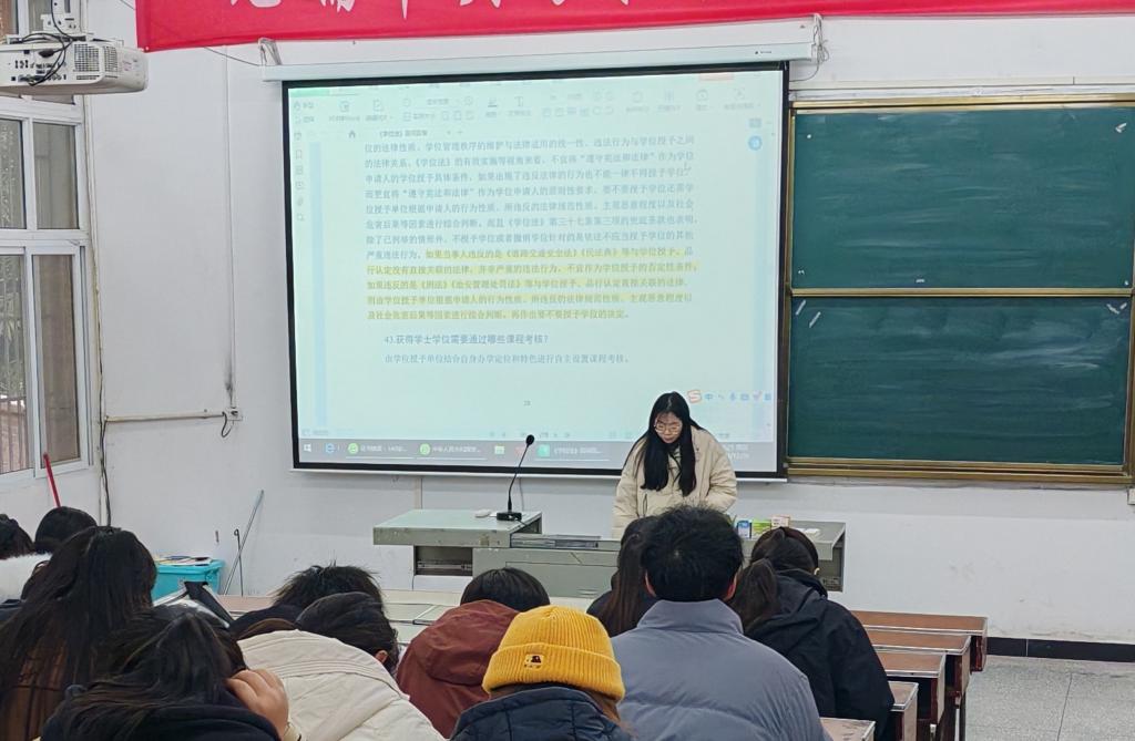 2024年12月26日晚,数学与统计学院组织开展了《学位法》百问百答学习专题活动,针对《学位法》理解和实施中的常见问题进行回答,旨在帮助师生更好地掌握《学位法》核心内容,推动法律在学术实践中的规范化实施。