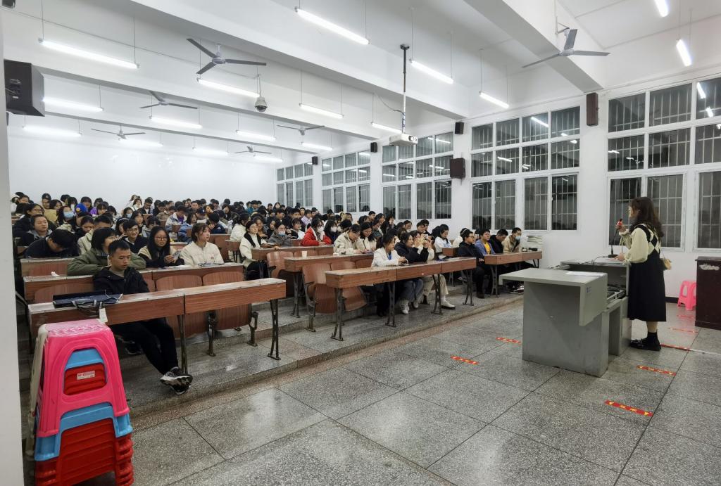随后,孙思同学以高中与大学的区别为引,先强调成绩带来的好处,如高的综测评分、不受组织招新成绩门槛影响、在考研复习中更容易等。随后,她为我们分享她的学习经验:课前预习、上课听讲、课后巩固和考前复习几方面易陷的误区,并给予建议。她鼓励大家当努力到一定程度时,幸运自然会不期而遇。