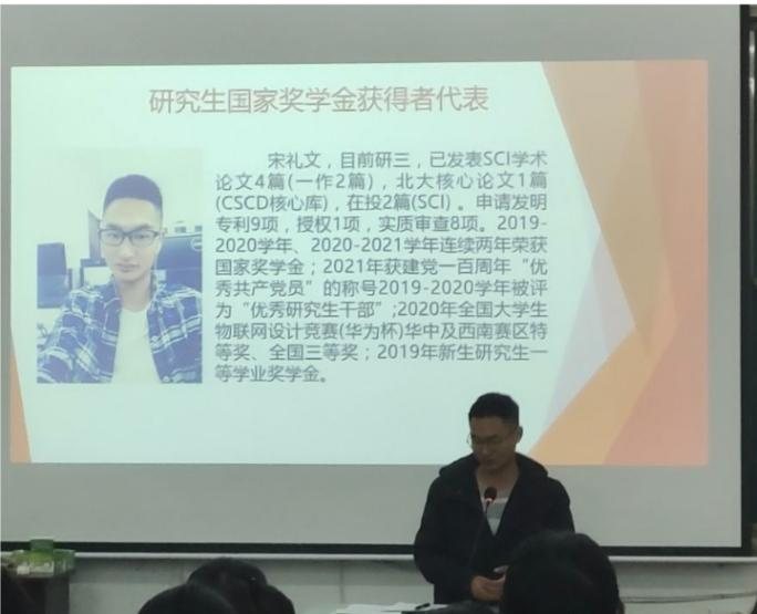 随后,对此次奖学金优秀获得者进行颁奖典礼,研究生国家奖学金获得者宋礼文、本科生一等奖学金获得者王汝英、本科生国家励志奖学金获得者李连武依次发表获奖感言,其中研三的宋礼文学长谈到:“生活不止实验,生活中的很多事情是与科研相关的,希望大家能多向发展。”