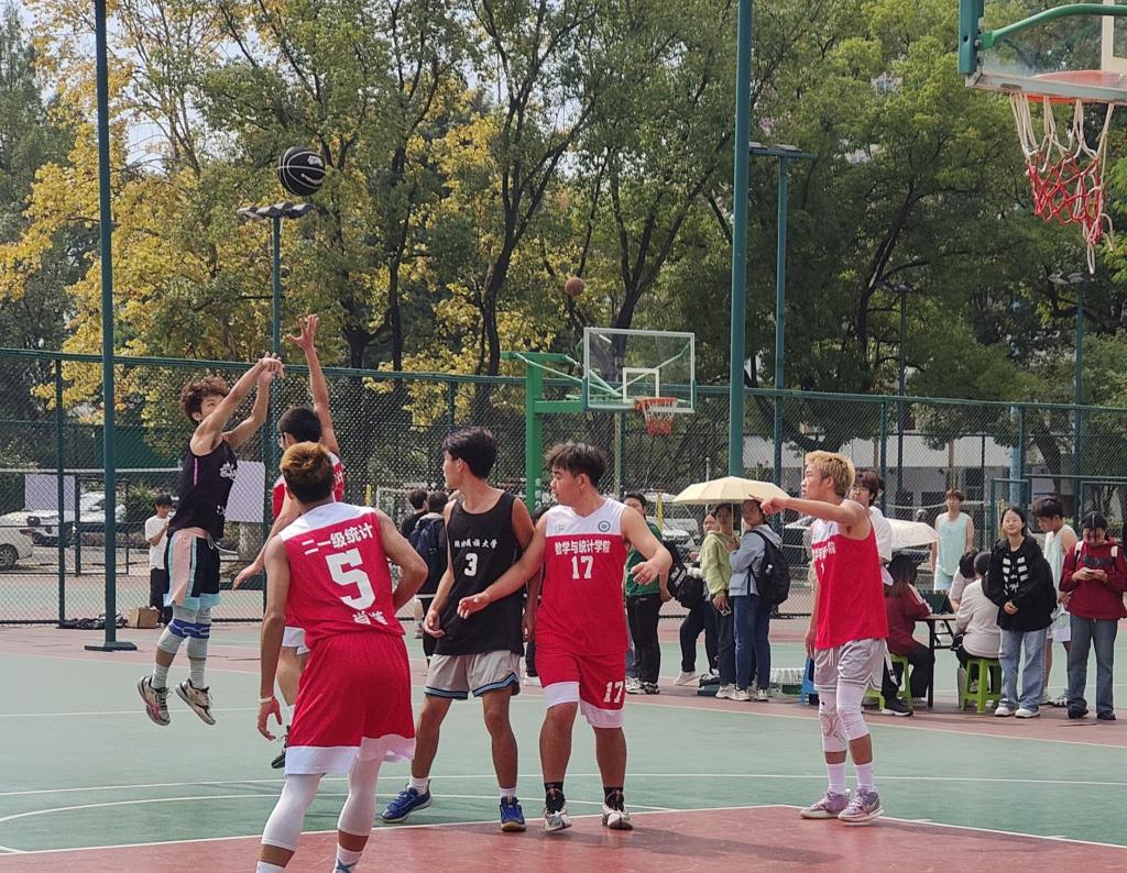 此次比赛,每一支队伍都拼尽全力。最后一场冠军争夺赛,21级数学队与21级统计队在队长的带领下来到篮球场。在简单的赛前动员后双方展开了激烈的角逐,双方比分交替上升,僵持不下。上半场比赛21级统计队凭借高昂的斗志和饱满的活力先拔头筹。在短暂的休息后比赛进入关键的下半场,两支队伍都严阵以待,最终21级统计以59:42的比分战胜对手,获得此次比赛冠军。