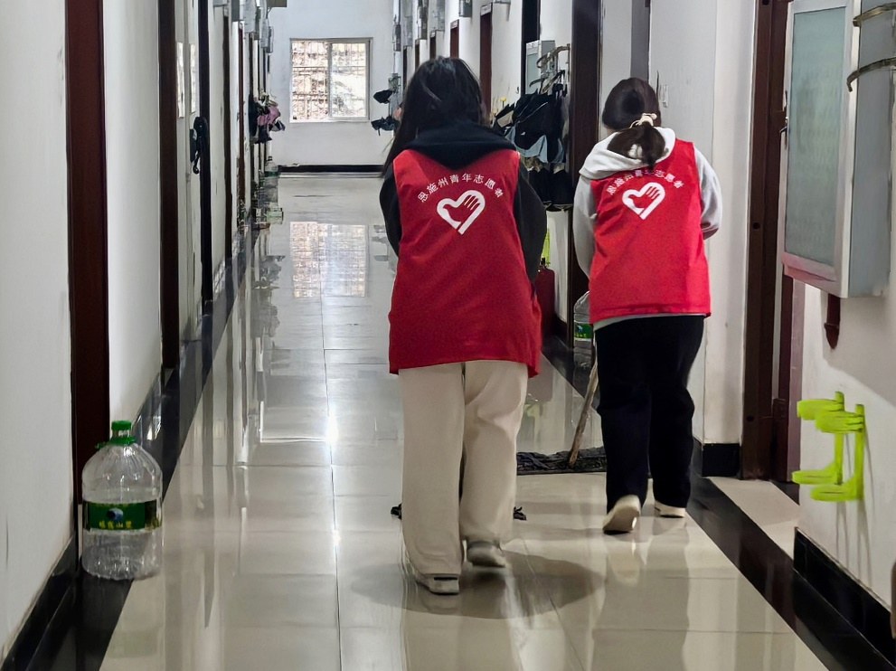 躬身劳动,以汗水映照微光。志愿者们化身“校园美容师”协助宿管阿姨清洁宿舍楼大厅、走廊、楼梯等公共区域,她们手持拖把、扫帚,认真细致地清理每一处角落,让宿舍楼的公共区域焕然一新,汗湿的鬓发与洁净的地面相映,书写着跨越年龄的默契。
