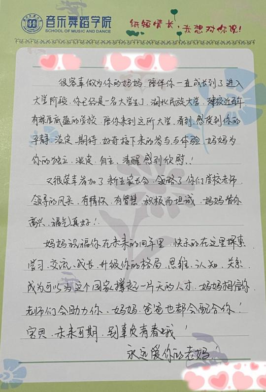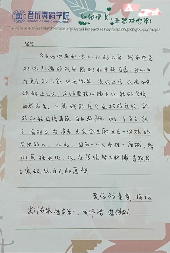 会上,全体新生家长共同观看了音乐舞蹈学院2024年招生宣传片和民族歌舞剧《老兵》宣传片,进一步加深了对学院师资力量、教育理念及学生成长环境的了解。在现场答疑环节,部分家长对学生未来职业选择、专业建设等提出疑问,与会领导与教师为家长们一一答疑解惑。会议最后,全体家长书写“纸短情长,我想对你说”温馨寄语,用纸笔写下对孩子们的无限期盼和祝福。
