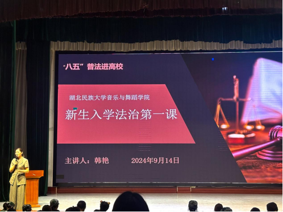 为深入学习贯彻党的二十届三中全会精神,进一步增强新生的法治观念与法治意识,促进平安校园、法治校园建设,9月14日,音乐舞蹈学院组织开展了2024级新生入学安全法治教育讲座活动。讲座由恩施州律师协会副秘书长、湖北省“七五”普法“先进个人”、湖北省律师行业“优秀共产党员”韩燕律师主讲。