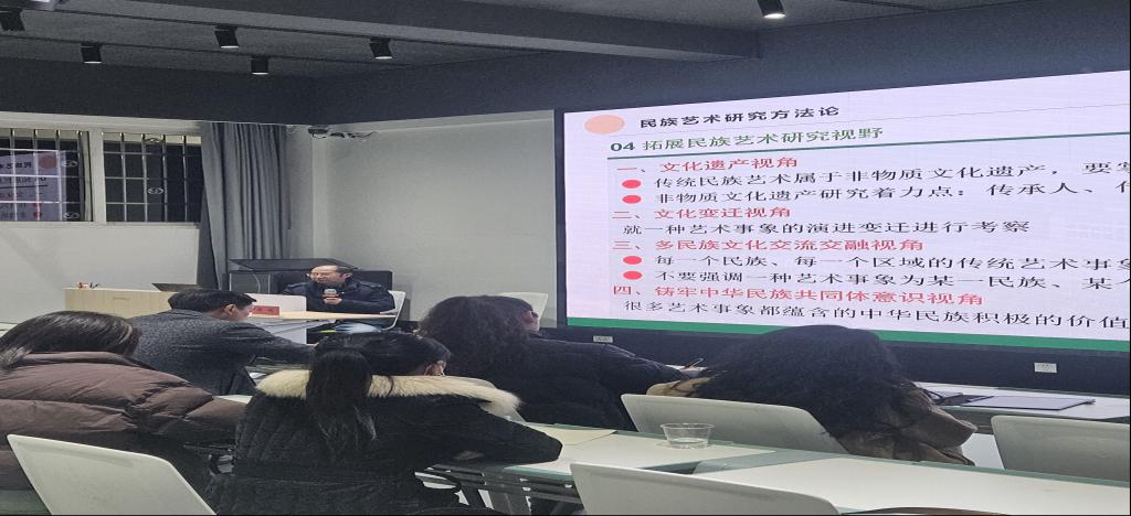 12月4日,中南民族大学教授段超在我院举办了"民族艺术研究方法"的专题讲座,本次讲座专业性强、立意深远、思想深刻,对我院构建先进的民族艺术学知识体系具有十分重要的指导意义。(段超,中南民族大学党委常委、副校长、二级教授、博士生导师,校学位评定委员会主席,中国民族学会副会长、中国民族史学会副会长、湖北省社联副主席,中南民族大学四部委铸牢中华民族共同体意识首席专家,入选中组部国家“万人计划”哲学社会科学领军人才,享受国务院政府特殊津贴专家。)讲座由院长谷秋阳主持,音乐舞蹈学院全体教师积极参加、认真聆听,并与段超教授和谐互动,提升了教师们对“民族艺术研究方法”的理解和更深层次的认知。