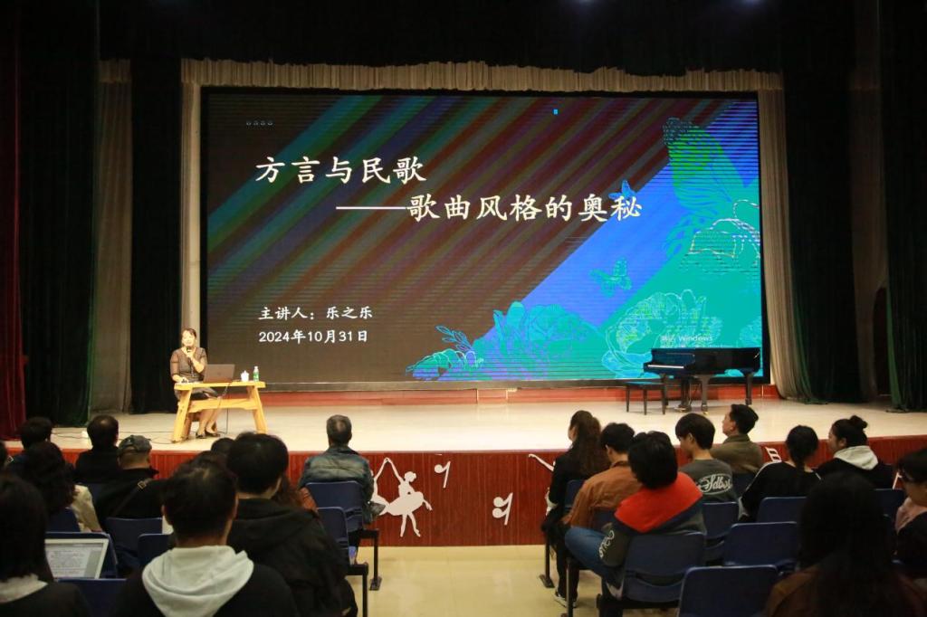2024年10月31日下午14点30分,吉首大学音乐舞蹈学院副院长、湖南省青年骨干教师、吉首大学俊彦学者、教育部评估专家乐之乐教授在音乐舞蹈学院演播厅举办了《方言与民歌 ——歌曲风格的奥秘》的讲座。参加本次讲座的有3044am永利集团3044noc音乐舞蹈学院党总支书记张蕊,院长谷秋阳,副院长焦娜、王松,音乐舞蹈学院全体教师及音乐系全体同学参加了此次活动。活动由院长谷秋阳主持。