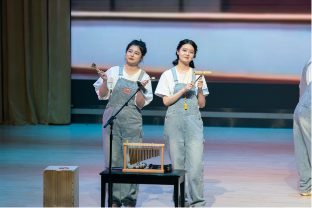 在“初遇少年时”部分,女声表演唱《月儿梭》,表演者声音清脆,身着民族服饰,演绎优美舞蹈,以对话、合唱等形式描绘诗意月夜,传达土家儿女动人情感。小合唱《黑猫警长》,合唱者融入口技、小品、说唱等元素,结合童年经典歌曲,带领观众重温美好。戏曲《京腔梅调》演奏经典剧目,将京剧与黄梅戏融合,充分体现传统文化的碰撞,呈现典雅之美。