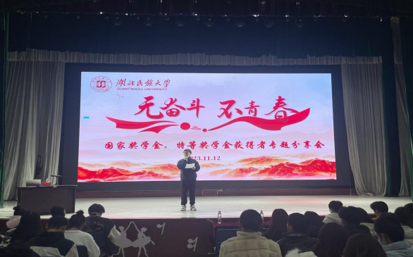 学海无涯勤可渡,书山万仞志能攀。 为了宣传先进典例,充分发挥国家奖学金、特等奖学金获得者的榜样力量,推动加强学风建设。11月12日,学院于演播厅开展“无奋斗,不青春—2023年度国家奖学金、特等奖学金获得者专题分享会”。张静怡、王俊娇两位国家奖学金获得者,白子扬、赵艺辞两位特等奖学金获得者依次上台进行了分享。2023级全体新生到场参加会议。
