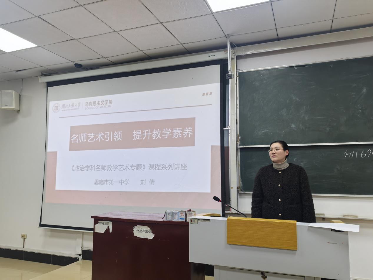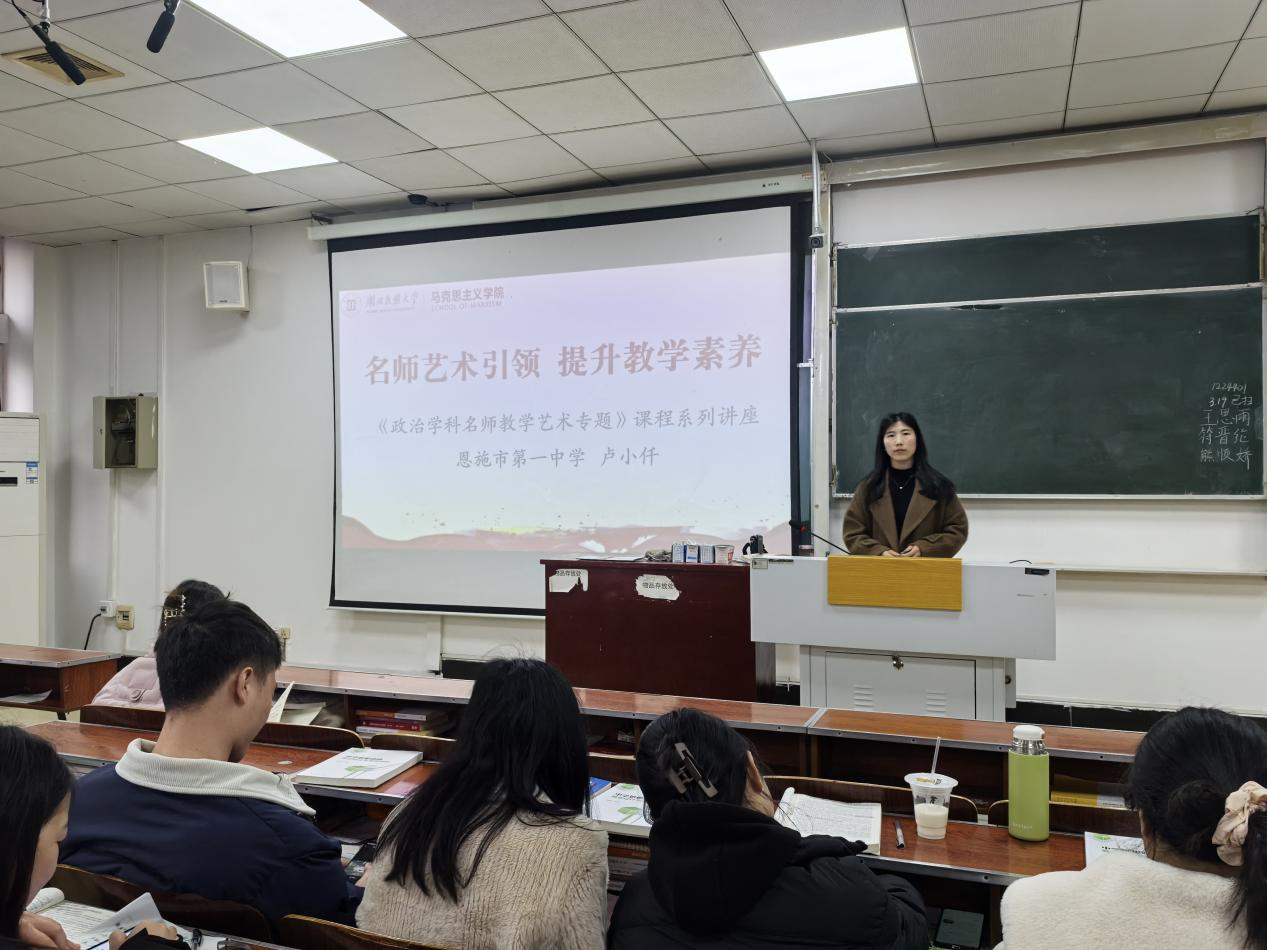 为充分发挥名师的示范、引领和辐射作用,提升师范生专业素养,3月以来,马克思主义学院以“名师艺术引领 提升教学素养”为主题举办《政治学科名师教学艺术专题》课程系列讲座。本次活动邀请来自恩施土家族苗族自治州高级中学、恩施市第一中学的四位一线名师担任主讲人。学院2022级思想政治教育专业全体学生参加活动。