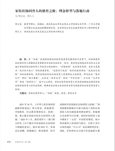 该文在“双减”政策持续推进和教育高质量发展的时代背景下,提出加快构建家校社协同育人的新格局,既是提高德育实效性的重要举措,也是重构教育生态的内在诉求。近年来,学院把强化研究生学术成绩、发展研究生科创事业摆在突出位置,学生科研成果的数量、质量逐年增加。在今后培养过程中,学院将进一步强化学生的学术创新、科学研究和成果转化能力,持续提升研究生培养质量。