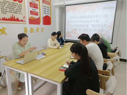 党员缴纳党费后,刘轩男带领党员、预备党员重温入党誓词,兰洁诵读党章。随后,杨婷组织党员学习《网络安全应知应会知识手册》、《关于恩施州城开展“爱在斑马线”文明交通主题活动工作方案》。理论学习环节,赵光荣领学党的二十大报告、党章、《习近平著作选读》、《习近平新时代中国特色社会主义思想专题摘编》;田金爽领学习近平对党的建设和组织工作作出的重要指示精神、全省组织工作会议精神,号召党员牢记“请党放心、强国有我”的青春誓言,书写上下一心、实干兴邦的青春篇章。
