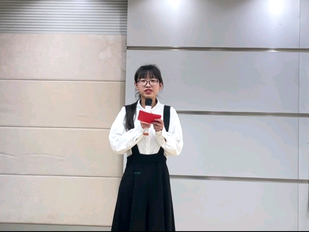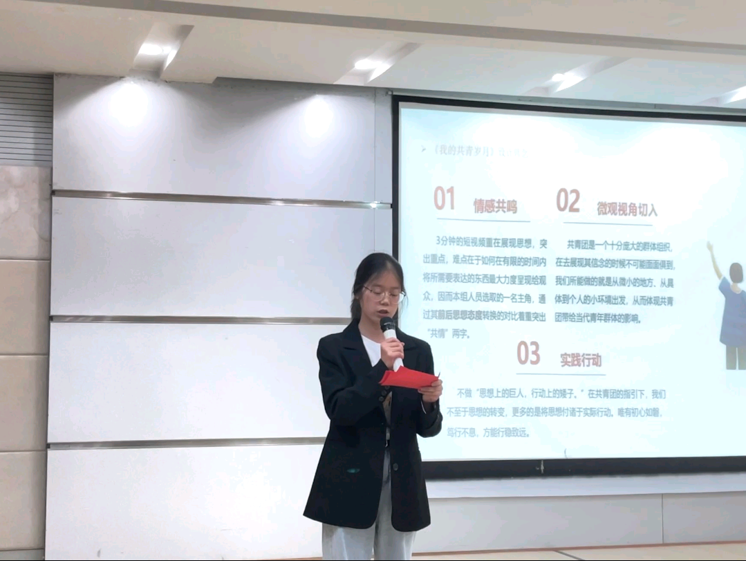 经过初赛的激烈角逐,共有11名选手进入决赛。在决赛环节中,参赛者提前准备视频讲解内容进行集中展示,由评委老师进行现场打分。每位选手依次讲述了他们的拍摄思路,拍摄背景及个人感悟,通过充满活力的视频和生动精炼的演讲,让在场观众对共青团的发展历史有了更清晰的了解。其中9号选手吴丁鑫的视频展示感情真挚,表达流畅,她回顾自己与共青团的故事,并分享入团后逐渐懂得作为一名共青团员的使命担当的感悟;4号选手邓紫琰进行视频展示,以舞蹈为载体展现团队成员作为追梦人在共青岁月中为梦奋斗、积极向上的青春活力;10号选手莫正兴讲述自己在团的带领下不再迷茫、找到追梦方向的历程,她表示青年学子要用青春拥抱时代,书写人生华章。最终,9号选手吴丁鑫荣获本次比赛一等奖。