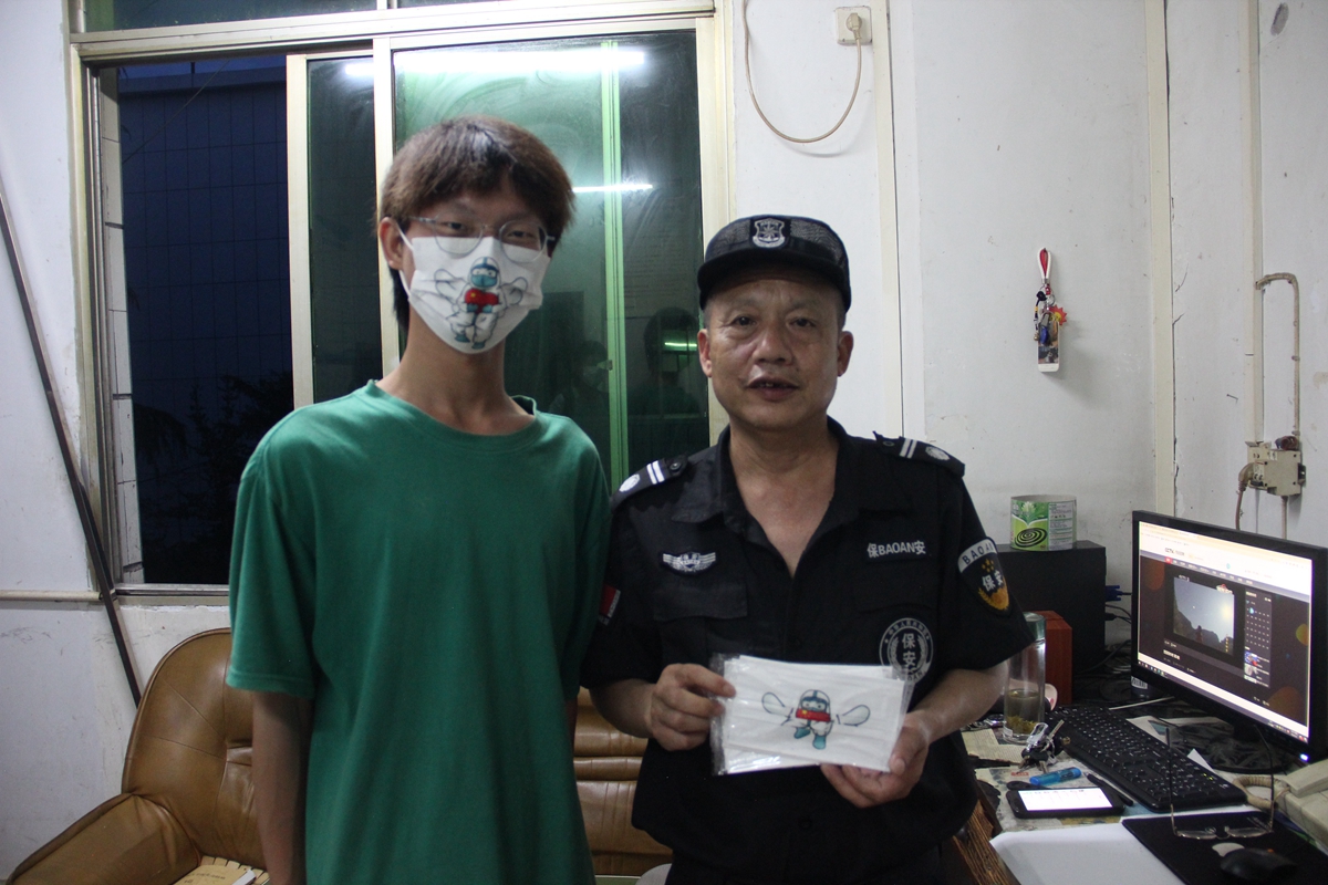 (给保安叔叔送口罩)