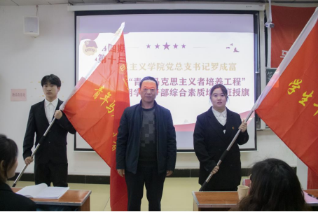 典礼在全体师生齐唱团歌中拉开序幕,张胥宣读第四期“青年马克思主义者培养工程”培训班和第十三期学生干部综合素质培训班学员名单;欧玲宣读“青年马克思主义者培养工程”培训班班级管理规定及第十三期学生干部综合素质培训班培养方案;罗成富为第四期“青年马克思主义者培养工程”培训班和第十三期学生干部综合素质培训班分别授旗并合影留念。第三期“青年马克思主义者培养工程”培训班优秀学员赵光荣和第十三期学生干部综合素质培训班学员代表戴艳红先后发言。