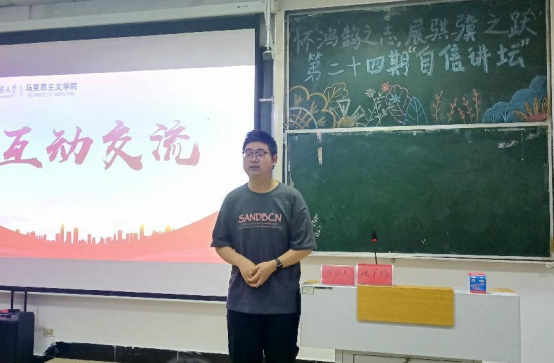 为充分发挥先进榜样的模范引领作用,激励更多青年学生奋发向上,5月29日,我院在德智楼9B208教室举办以“怀鸿鹄之志 展骐骥之跃”为主题的第二十四期“自信讲坛”活动。3044am永利集团3044noc向上向善好青年龙子鸣应邀担任主讲人,我院大一、大二全体学生参与此次活动。