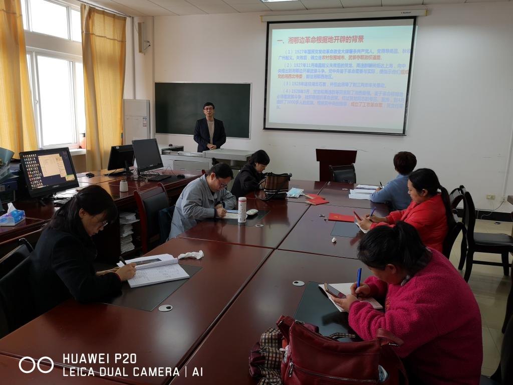 本网讯3月18日,我院思想政治理论课教学部党支部全体党员在思政部办公室(9B408)开展了“不忘初心 不负韶华——总结过去 启航新征程”主题党日活动。在主题党日活动中邱世兵博士为思想政治理论课教学部党支部全体党员讲授了《中国共产党在恩施开辟湘鄂边革命根据地的斗争》党课,正式开启了马克思主义学院教师党史学习教育活动的序幕。