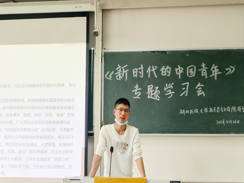 本网讯(通讯员 吴丁鑫 田金爽/文 钟静双/图)4月21日,国务院新闻办公室发布《新时代的中国青年》白皮书,为砥砺新时代中国青年奋进新征程、建功新时代,我院于4月26日在德智楼9B210教室组织开展《新时代的中国青年》白皮书专题学习活动,我院团总支书记毛召应邀出席并担任领学人,我院大一大二全体学生及主要学生干部参与学习。
