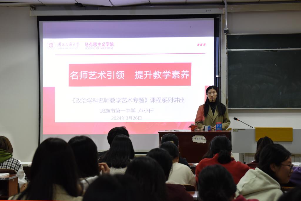 马克思主义学院开展系列讲座活动,是学院提升师范生教学技能的重要举措。通过中学名师进行课堂教学展示,充分发挥一线名师的示范、引领、辐射作用,使师范生近距离了解中学思政教育实际,充分认清当前课堂教学改革的新动向。在具体授课观摩中学会精心设计教学活动,呈现梯度性问题,坚持主导性与主体性相统一,为师范生今后的教学实践夯实基础。