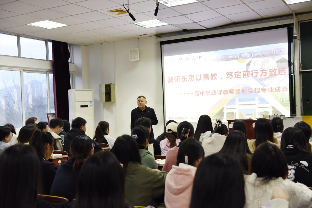 4月2日,我院在德智楼9B210教室开展以“名师艺术引领 提升教学素养”为主题的《政治学科名师教学艺术专题》课程第二场讲座。恩施高中政治高级教师高波受邀担任主讲人,我院党政办公室主任崔蕤主持,我院2021级思想政治教育专业全体学生聆听讲座。