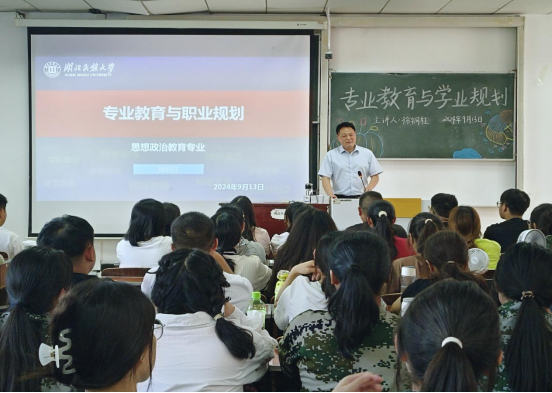 学院院长徐铜柱以“专业教育与职业规划”为主题,从办学历史、学科专业发展、师资队伍、学科方向、人才培养等方面为学生们详细介绍了学院的整体情况。徐铜柱院长结合现实事例,从师范技能的角度,指出思政专业学生要在书法、演讲、写作、实践、信息五个方面下功夫,强调培养实践创新能力是思政专业建设的亮色,学生要从实际情况出发,养成独立思考的能力,从而明确自己的职业发展方向。