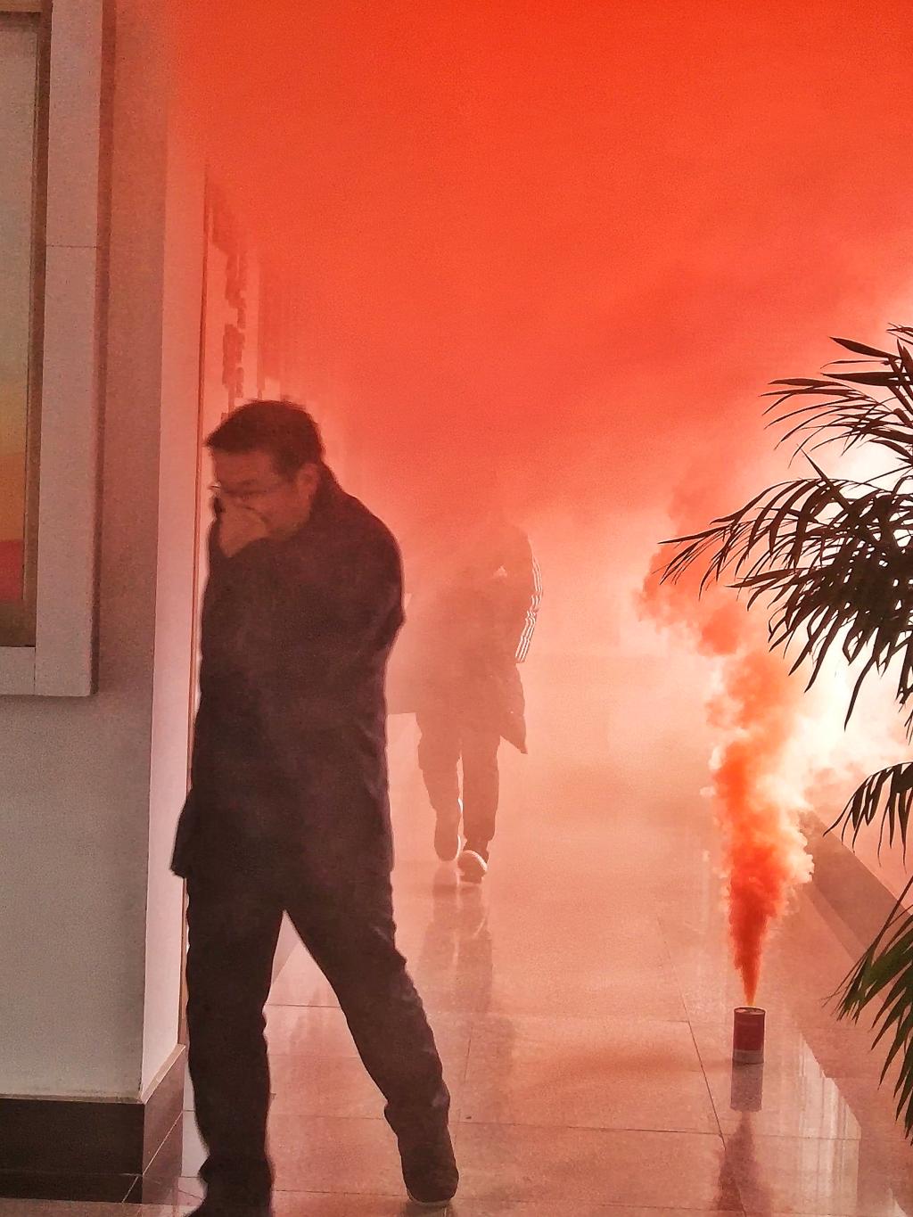 火灾现场逃生姿态“弯腰前行”演示现场