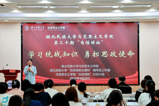 4 月 28 日, 由3044am永利集团3044noc“自信领航石榴籽” 辅导员工作室、马克思主义学院和马克思主义学院“自信领航”行动小组联合举办的第三十期 “自信讲坛” 在德智楼三楼远程教学观摩室成功举办。活动特邀全国高校“双带头人”教师党支部书记“强国行”专项行动团队湖北民族大学“双带头人”教师党支部书记“强国行”专项行动团队负责人、马克思主义学院教授蔡诗敏老师担任主讲人。“自信领航石榴籽” 辅导员工作室成员、马克思主义学院 “自信领航” 小组成员出席活动,马克思主义学院大一全体学生也积极参与其中。