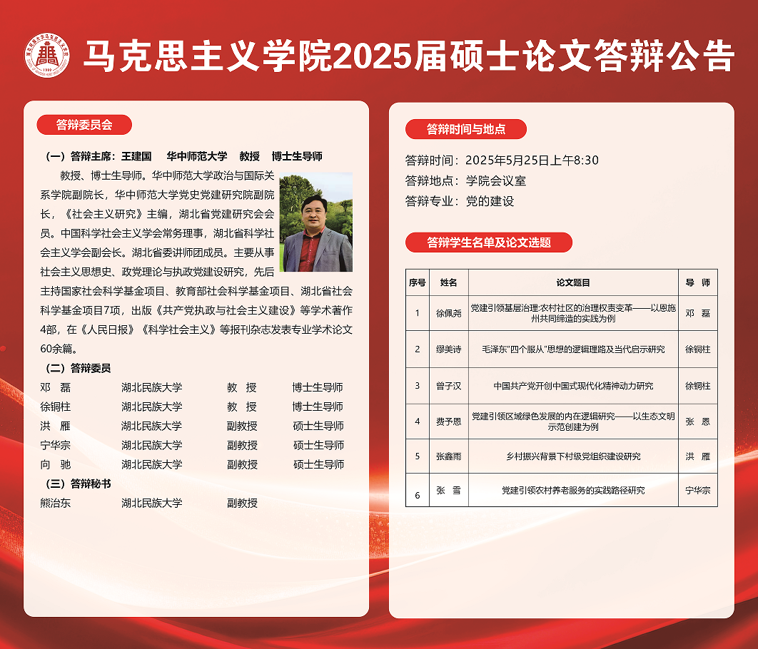 马克思主义学院2025年春季硕士研究生毕业论文答辩公告(四)