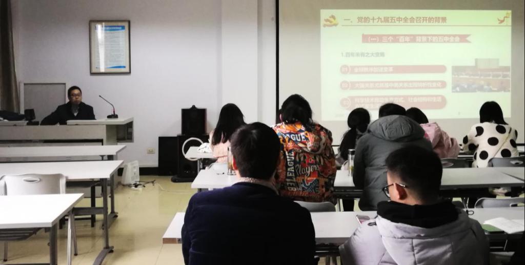 (通讯员 曾袆蕾)12月17日,马克思主义学院张明波副院长受邀到我院7304教室作题为“党的十九届五中全会”专题讲座,讲座由田英书记主持,学院全体教工党员参加。
