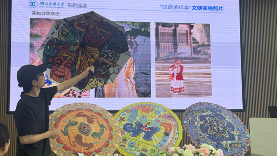 研讨会上各小组负责人向专家们展示了本组的创新设计方案。项目组姜蓓美副教授代表一年级学生展示设计方案,并予以点评。学生们巧妙地从恩施州博物馆的馆藏文物中提取特色纹样,设计出丝巾、雨伞等文创产品,这些作品不仅保留了传统纹样的艺术美感,更通过现代设计手法赋予其新的生命力,展现出极高的创新性和吸引力;展示过程中,姜蓓美副教授积极引导学生与现场嘉宾进行互动,热情地分享学生们的设计灵感和创作过程。