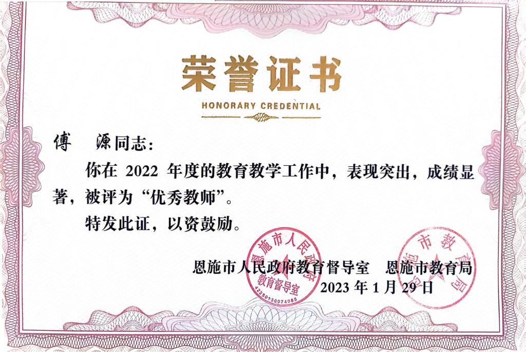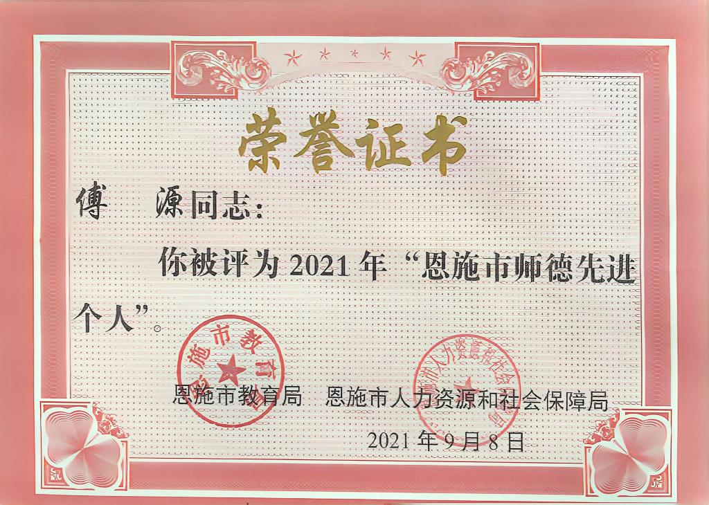 2008 年 6 月,傅源大学毕业,怀着对教育事业的满腔赤诚,她始终扎根于基础教育的肥沃土壤,默默耕耘,静候花开。其先后于宜昌市葛洲坝实验小学、巴东县大支坪小学、宣恩县高罗小学任教。2014 年,她考入恩施市硒都民族实验小学,担任发展中心副主任。